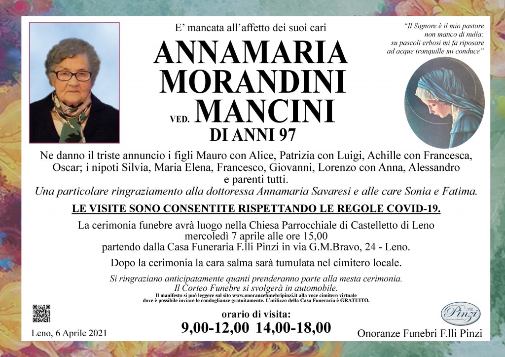 Desideriamo ringraziare tutti coloro che ci sono stati vicini in questo triste momento con la loro partecipazione al nostro dolore per la perdita della cara Annamaria. Siete stati tanto numerosi e tanto generosi che ci risulta difficile potervi raggiungere uno ad uno per esprimervi personalmente la nostra gratitudine, anche perché molti di noi familiari sono confinati nelle proprie abitazioni a causa dell’emergenza sanitaria. Mauro con Alice, Patrizia con Luigi, Achille con Francesca, Oscar, Silvia, Maria Elena, Francesco, Giovanni, Lorenzo con Anna, Alessandro