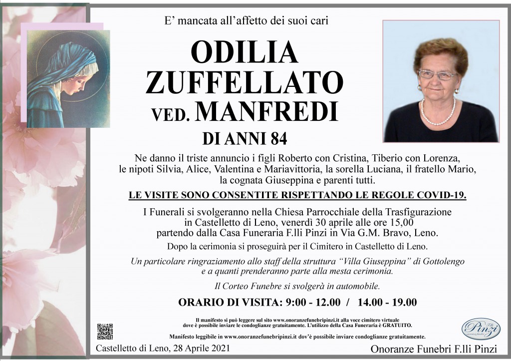 Partecipo al lutto per la scomparsa della Signora Odilia. Sono vicina ai figli e famigliari tutti