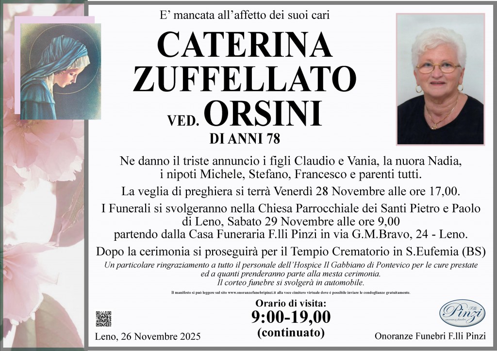 Esprimiamo le nostre più sentite condoglianze ai figli e ai tutti i famigliari per la perdita della cara Sig. Caterina che ricorderemo sempre con affetto per la sua bontà d’animo, Antonella, Giancarlo, Davide e Daniele